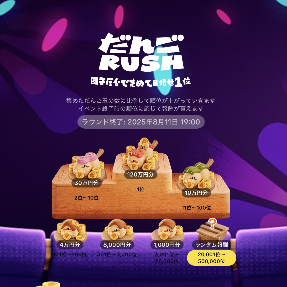 だんごRUSHイベント終了後、最終順位に基づき上位500000名のユーザーに順位に応じた報酬が付与されます。